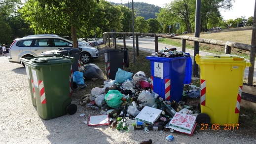 L’associazione ecologista Gruppo d’Intervento Giuridico onlus ha segnalato (3 settembre 2017) la presenza di numerosi rifiuti che si sono accumulati attorno ai cassonetti dell’immondizia in località Passo Fiorine, nel comune di Teolo (PD).