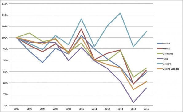 Europa, variazione consumi di gas naturale 2005-2015 (elaborazione Sicurezza Energetica su dati SRG 2017)