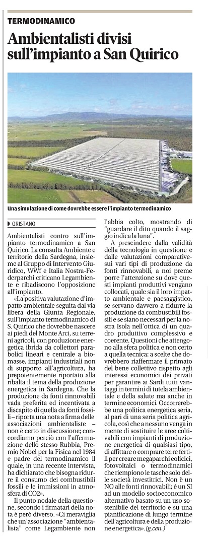 «Sì al termodinamico, ma non in aree agricole». Comitato di San Quirico e Gruppo di intervento giuridico replicano a Rubbia. Garau: «Non hanno scelto una zona industriale perché costerebbe di più». (Roberto Petretto) (http://www.lanuovasardegna.it/oristano/cronaca/2018/01/12/news/si-al-termodinamico-ma-non-in-aree-agricole-1.16343976?ref=hfnsorer-2)