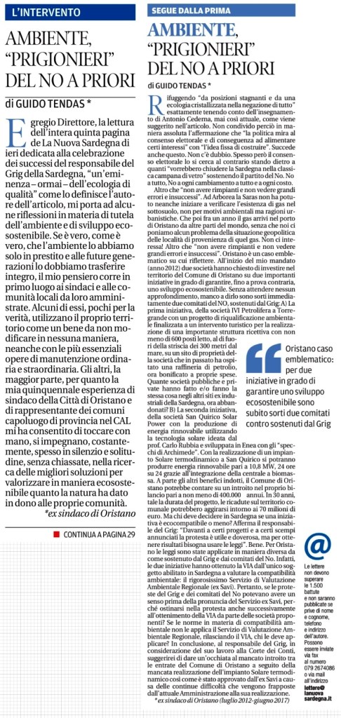 ho letto sull’edizione odierna del Quotidiano da Lei diretto l’intervento di Guido Tendas, già sindaco di Oristano, in replica alla mia intervista pubblicata su La Nuova di domenica 18 agosto scorso e Le chiedo ospitalità per alcune brevi precisazioni, vista le numerose “imprecisioni” e amnesie dell’Amministratore locale che riguardano direttamente il Gruppo d’Intervento Giuridico onlus, associazione ecologista che ho il grande onore (e ònere) di coordinare.