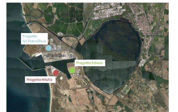 Nella zona baricentrica di Oristano – S. Giusta sono stati autorizzati tre depositi costieri (IVI Petrolifera, Higas, Edison) per uno stoccaggio complessivo pari a 28 mila metri cubi: anch’essi avrebbero dovuto esser sottoposti a una valutazione degli impatti ambientali cumulativi, non svolta.