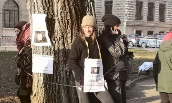 Bergamo, attivisti in catene in piazza per salvare undici alberi.