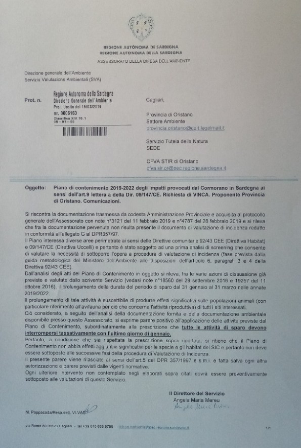L’Assessore della Difesa dell’Ambiente della Regione autonoma della Sardegna ha, invece, confermato (nota prot. n. 2147 del 5 marzo 2020) il provvedimento di proroga della caccia al Cormorano fino al 15 marzo 2020, basandosi, di fatto, sulla mera richiesta effettuata in data 4 febbraio 2020 del Nuovo Consorzio Cooperative Pontis, operante nel solo Stagno di Cabras, e giustificandola con il solo parere I.S.P.R.A.