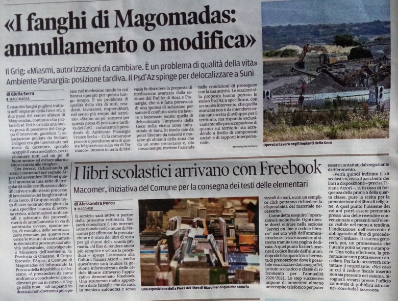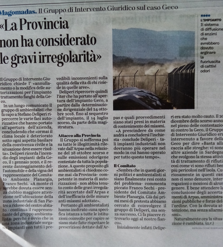 Fanghi a Magomadas, gli ambientalisti chiedono uno stop o una modifica delle autorizzazioni. Il Gruppo di intervento giuridico ha chiesto di vedere gli atti autorizzativi della Geco srl: https://www.lanuovasardegna.it/oristano/cronaca/2020/07/27/news/fanghi-a-magomadas-gli-ambientalisti-chiedono-uno-stop-o-una-modifica-delle-autorizzazioni-1.39129575