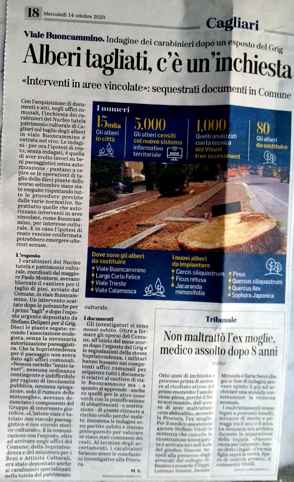 Dalla formale risposta pervenuta da parte del Comune di Cagliari – Servizio parchi, verde e gestione faunistica (nota prot. n. 243332 dell’1 ottobre 2020) è stato possibile accertare che l’abbattimento degli alberi è avvenuto sulla base di un mero ordine di servizio (il n. 75/2 del 22 agosto 2020) del Direttore dell’esecuzione del contratto (DEC) di gestione del verde pubblico cittadino, figura che non pare avere alcuna capacità decisionale autonoma su eventuali tagli di alberi.