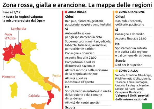 Quattro Regioni in zona rossa, due in zona arancione, le restanti in zona gialla: il premier Giuseppe Conte, in diretta tv, elenca le tre fasce in cui l’Italia, da qui al 3 dicembre, sarà divisa a seconda del livello di rischio legato al Covid e alla tenuta sanitaria. A ciascun “colore” è affidato un pacchetto di misure ad hoc: la zona rossa, di fatto, prevede un lockdown. In tutto il Paese il coprifuoco scatta alle 22.