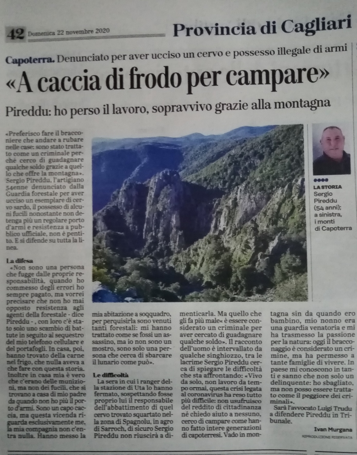 I provvedimenti nell’ambito dell’inchiesta su bracconaggio e ricettazione di carne di animali protetti. (Andrea Manunza) (https://www.unionesarda.it/articolo/news-sardegna/cagliari/2021/01/08/caccia-di-frodo-e-armi-un-arresto-e-due-obblighi-di-dimora-136-1101899.html)