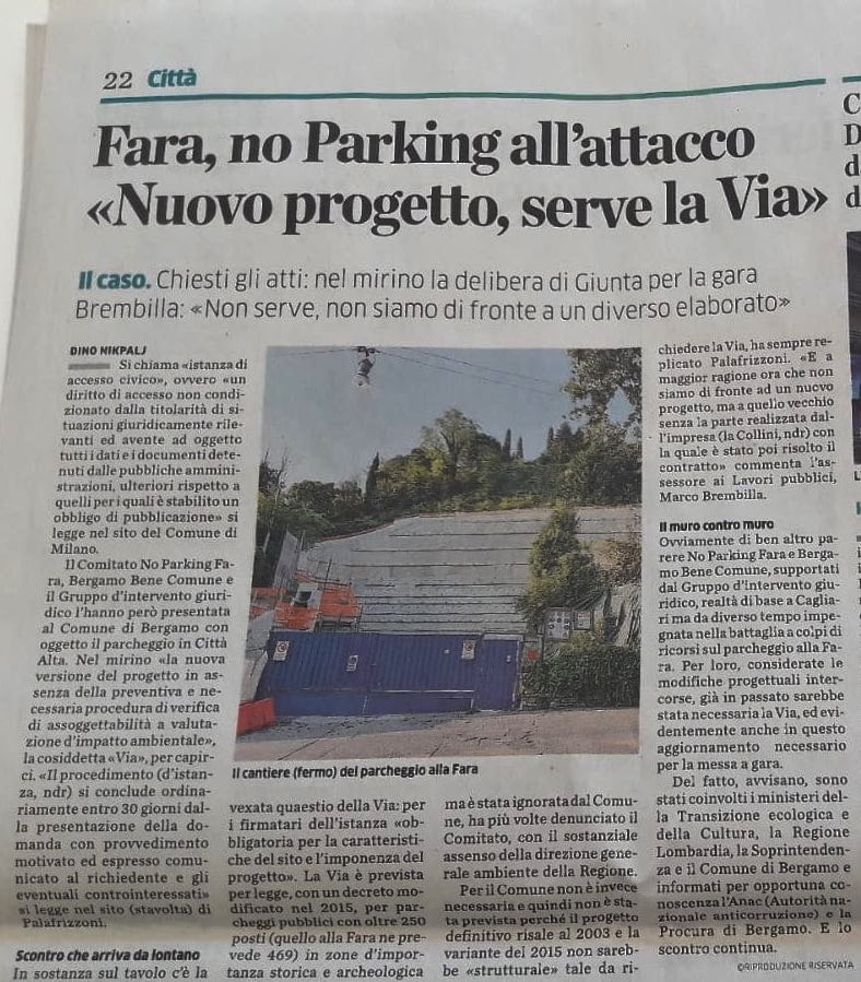 Ancora una volta il parcheggio nel centro storico di Bergamo (Parking Fara) senza le procedure di valutazione di impatto ambientale.