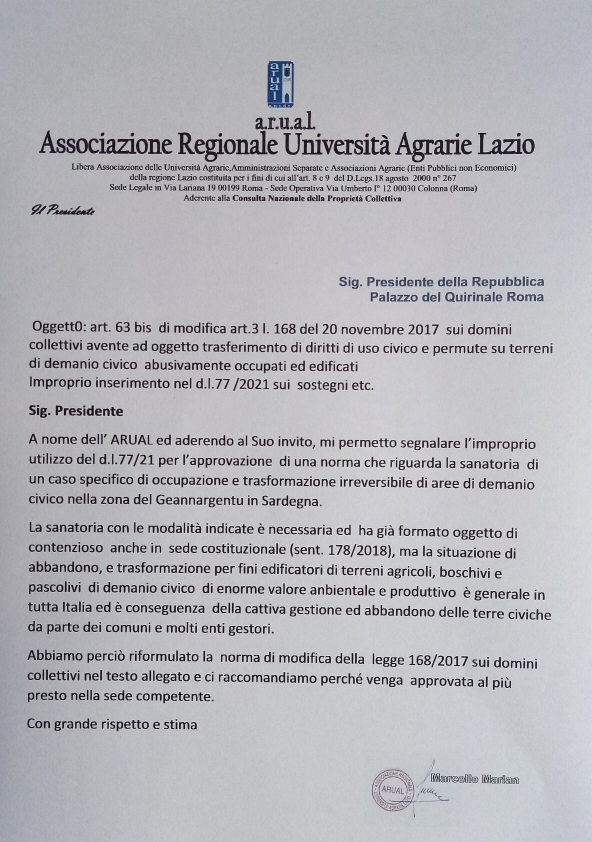 non è la lettera dell’ARUAL da te sottoscritta? Ma che cosa curiosa! Pensa che è pubblicata con grande rilievo in homepage sul sito web demaniocivico.it, qui https://www.demaniocivico.it/notiziario/notizie/2079-esposto-di-associazione-regionale-universita-agrarie-del-lazio-arual-al-presidente-della-repubblica, https://www.demaniocivico.it/attachments/article/2079/CARTA%20INTESTATA%20QUIRINALE%20athena%20%20%20-%20Copia.pdf