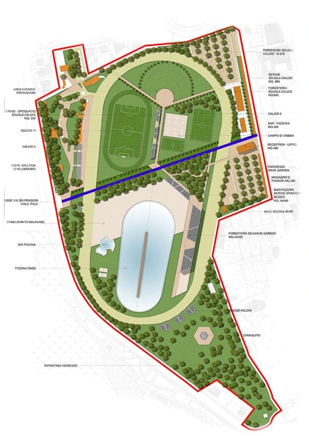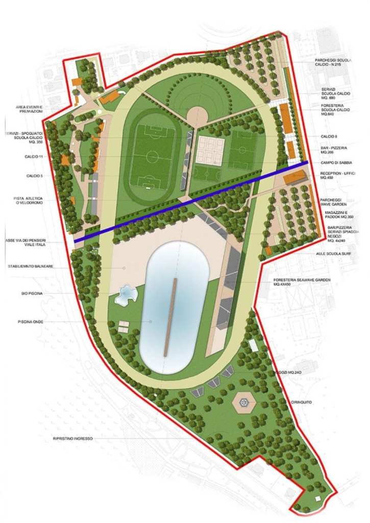 non c’è scritto da nessuna parte che il surf è “malsano”, è “malsano” il progetto (con tanto di alberghi, ben citati nell’idea progettuale, prima immagine di questo articolo) di sbaraccare l’Ippodromo esistente, con un progetto di riqualificazione già realizzato per due lotti (manca il terzo) costati già milioni di euro di fondi pubblici per un’alternativa di fatto irrealizzabile per vincoli ambientali esistenti, investimenti ancora una volta di soldi pubblici tanto ingenti quanto inesistenti.