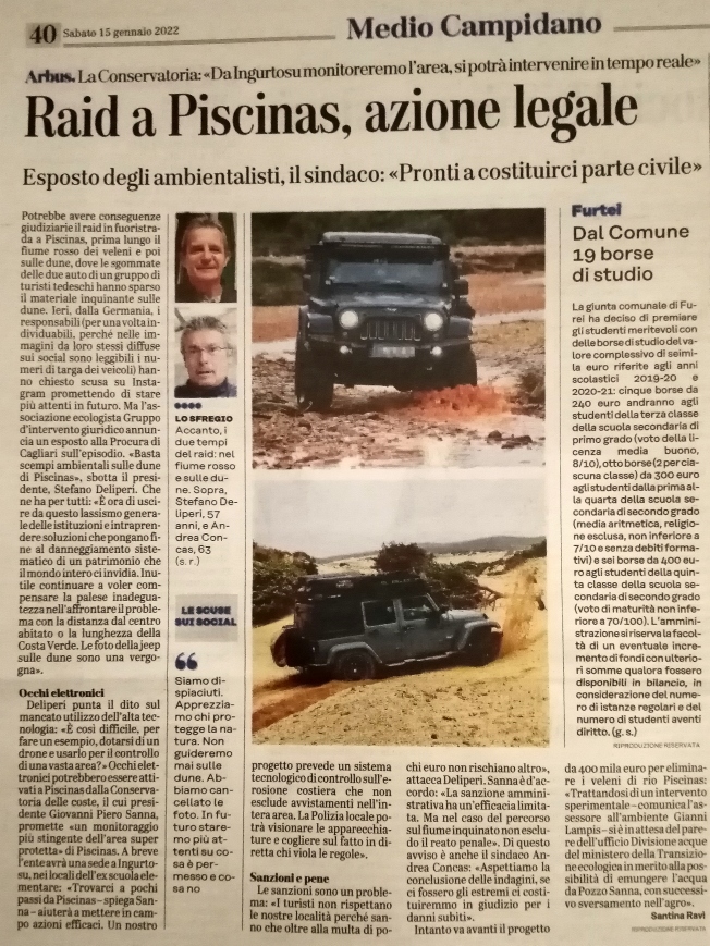Spero che la doverosa iniziativa del Grig abbia un seguito pesante per i due sfregiatori delle dune di Piscinas , servirebbe da esempio anche se ritengo che la strada da percorrere, per prevenire simili danni sia ancora molto lunga.
