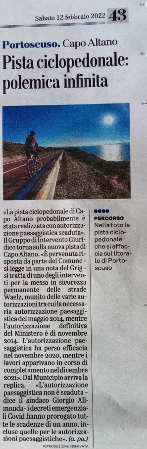 E’ pervenuta la risposta (nota prot. n. 2051 dell’8 febbraio 2022) da parte del Comune di Portoscuso (SU) all’istanza di accesso civico, informazioni ambientali e adozione degli opportuni provvedimenti (14 gennaio 2022) per verificare la sussistenza o meno delle necessarie autorizzazioni amministrative per l’avvenuta realizzazione di una rossa pista ciclo-pedonale su una preesistente viabilità a Capo Altano.