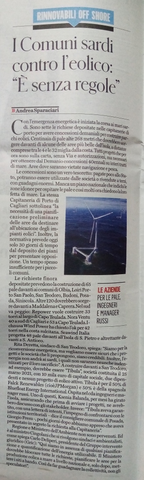 “Sempre più Far West nei mari sardi, l’Isola circondata da torri eoliche”.