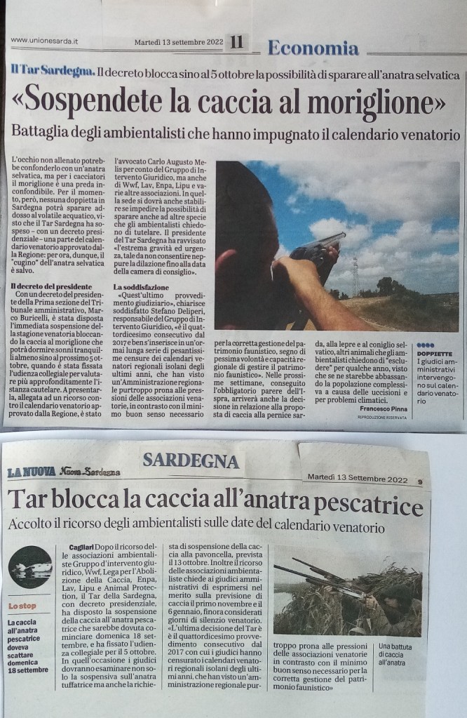 Caccia: il Tar sospende il prelievo dell’anatra tuffatrice: https://www.ansa.it/sardegna/notizie/2022/09/12/caccia-il-tar-sospende-il-prelievo-dellanatra-tuffatrice_2ec3b3b0-1e92-468f-a97a-f9b7bb65d25f.html