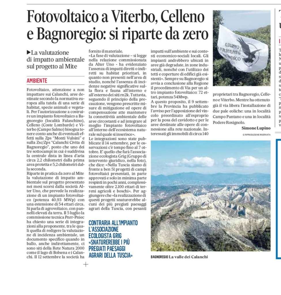 Il Ministero della Transizione Ecologica – Commissione tecnica PNRR-PNIEC, sfatando l’idea che la vorrebbe fin troppo di manica larga, nei mesi scorsi (nota prot. n. 4522 del 5 luglio 2022), nell’ambito del procedimento di valutazione di impatto ambientale (V.I.A.) in corso, aveva in buona sostanza rispedito al mittente il progetto per la realizzazione di una centrale fotovoltaica (potenza 40,93 MWp) estesa più di 54 ettari nelle campagne e nelle macchie di Falaschino (Bagnoregio), Coste Lombarde (Celleno e Viterbo), Campo Salmo (Viterbo) e Grotte S. Stefano (Viterbo e Vitorchiano), in una zona già aggredita dalla speculazione energetica.