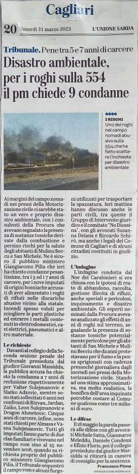 30 marzo 2023, nuova udienza davanti al I Collegio del Tribunale di Cagliari relativa al dibattimento penale nei confronti di S. R. + 8 per rispondere del devastante inquinamento causato dai sistematici roghi di rifiuti e discarica abusiva contigua al campo rom abusivo lungo la strada statale n. 554, presso gli edifici della Motorizzazione Civile, nel territorio comunale di Cagliari.