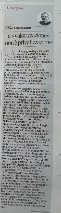 Resta il fatto – analogamente a quanto già visto relativamente alla batteria costiera dismessa di Punta Giglio (Alghero) – di un bene pubblico ambientale e culturale riguardo cui le amministrazioni pubbliche competenti (in primo luogo Regione e Comuni) abdicano al loro ruolo gestionale per favorire l’ingresso di Soggetti privati non certo giunti per fare i disinteressati benefattori.