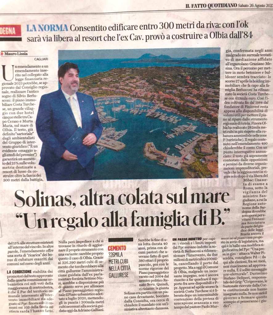 La Regione Sardegna ci riprova: riparte – armata di cemento – all’assalto delle coste regionali. Il bersaglio grande della giunta di centrodestra guidata da Christian Solinas è il Piano paesaggistico regionale. L’assessore all’Urbanistica Aldo Salaris, come ha scritto il Manifesto, ha inviato al ministro della Cultura Gennaro Sangiuliano una richiesta di modifica della normativa che protegge la costa tra le più belle del mondo perché – dice Salaris – “la Sardegna ha bisogno di una nuova pianificazione del territorio“. Il ministero valuterà la bozza partita da Cagliari e risponderà a fine settembre. Nell’attesa, però, la Regione non ha perso tempo e ha già iniziato la sua battaglia sotterranea all’arrembaggio dei litorali. In un emendamento alla manovra finanziaria regionale – presentato dallo stesso assessore Salaris – è uscito fuori anche un faraonico regalo agli alberghi di lusso: si prevedono incrementi volumetrici delle strutture ricettive situate nelle zone F, anche nella fascia dei trecento metri dalla battigia. Questo significa che i nuovi alberghi a cinque stelle potrebbero ottenere un incremento volumetrico del 25 per cento, mentre per quelli già esistenti sarà del 15 per cento, ma senza aumento dei posti letto. Al momento il testo è stato approvato in commissione a maggioranza e con il voto contrario delle opposizioni e quindi approderà in consiglio regionale. Le due strade – le modifiche al piano paesaggistico e l’emendamento per cementificare – vanno insieme perché la Corte costituzionale ha sempre respinto le riforme urbanistiche rimandando proprio al Piano paesaggistico, che resiste – nonostante i tentativi finora andati a vuoto – dal 2006.