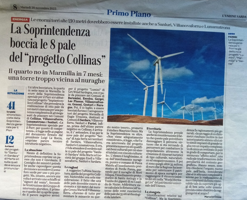 * parere negativo prot. n. 27154 del 20 novembre 2023, relativo al progetto “Impianto eolico di Collinas”, presentato dalla Sorgenia Renewables s.r.l., comprendente otto torri eoliche – una delle quali a soli 750 metri dal Nuraghe Genna Maria – (48 MW di potenza complessiva) nei Comuni di Collinas, Villanovaforru, Lunamatrona e Sanluri. Una parte delle opere rientra addirittura nel demanio civico di Collinas.