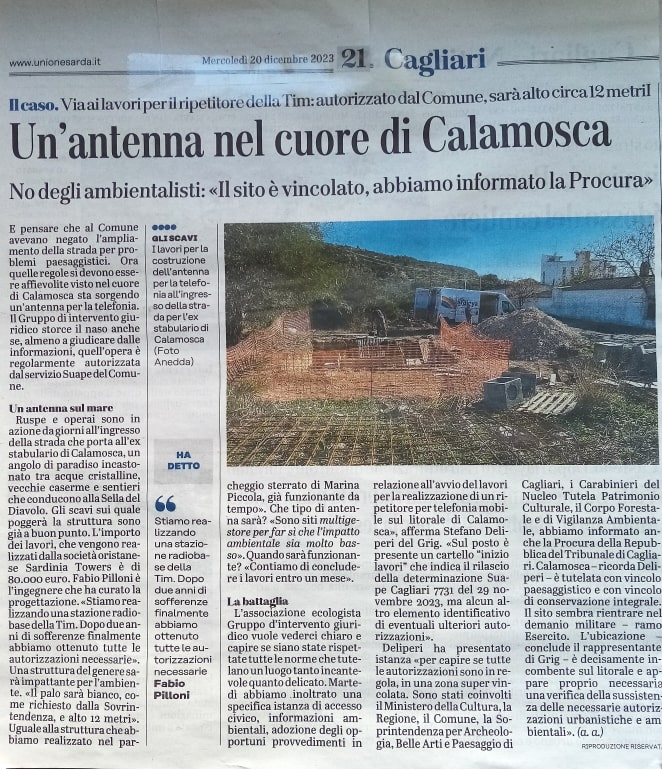 L’associazione ecologista Gruppo d’Intervento Giuridico (GrIG) ha inoltrato (19 dicembre 2023) una specifica istanza di accesso civico, informazioni ambientali, adozione degli opportuni provvedimenti in relazione all’avvìo del lavori per la realizzazione di un ripetitore per telefonìa mobile sul litorale di Cala Mosca, in Comune di Cagliari.