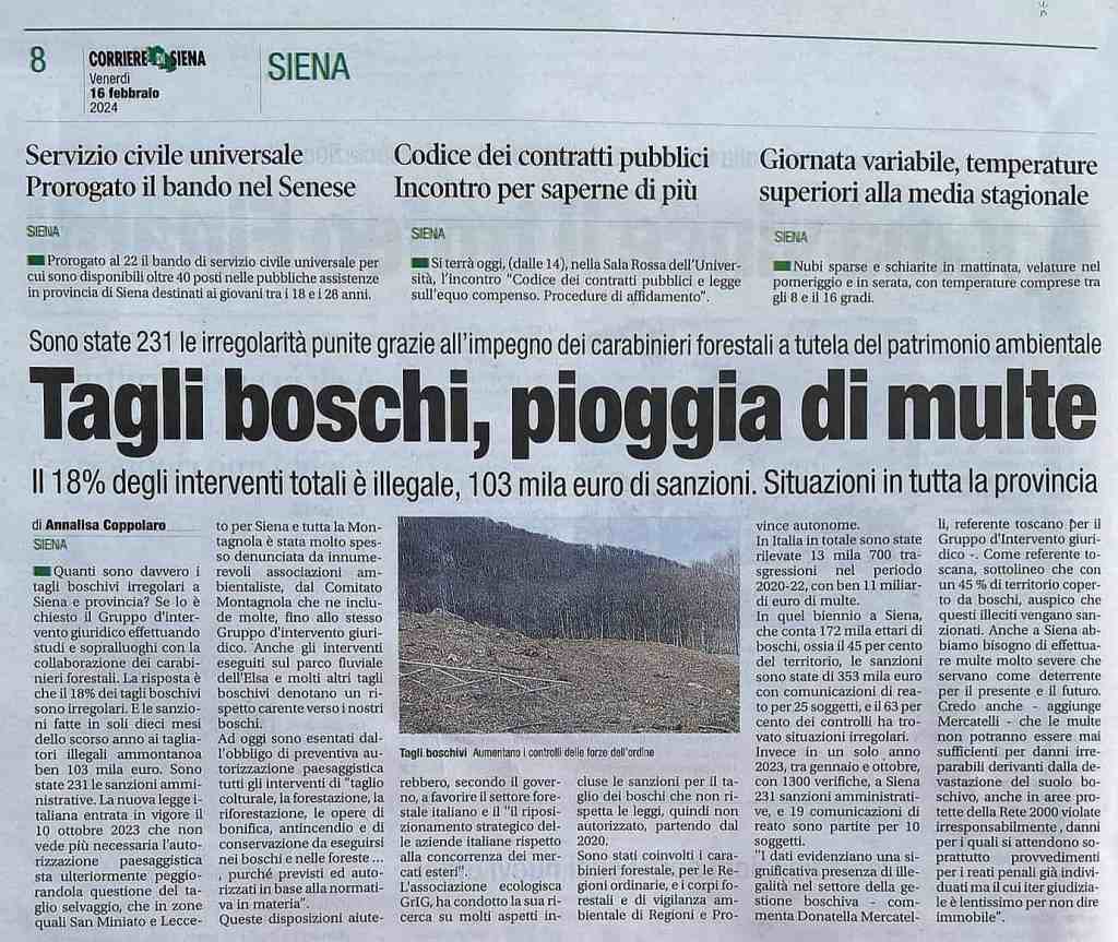Si, come penso di averlo già detto, io sono referente Toscana del GrIG , pertanto le ultime 14 righe del documento, potrebbero essere scritte come mio commento perché sono le osservazioni condivise da tutto il gruppo e il quindi le mie come referente Toscana visto anche la % del suolo boschivo che ha la nostra regione superiore al 45% penso vada bene così altrimenti si può mettere che auspico che questi illeciti vengano sanzionati Con multe molto severe che servano come deterrente per il presente e il futuro anche se non potranno essere mai sufficienti per danni irreparabili derivanti dalla devastazione del suolo boschivo anche in aree protette della Rete 2000 violate irresponsabilmente , danni per i quali si attendono soprattutto provvedimenti per i reati penali già individuati ma il cui iter giudiziale è lentissimo per non dire immobile, grazie ancora, Donatella Mercatelli