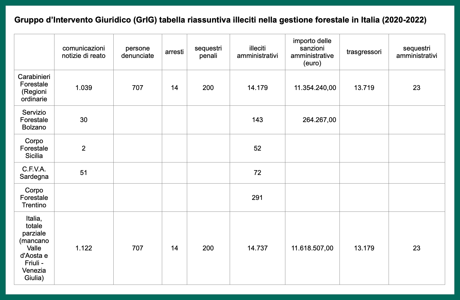 Italia, tabella riassuntiva illeciti forestali (2020-2022)