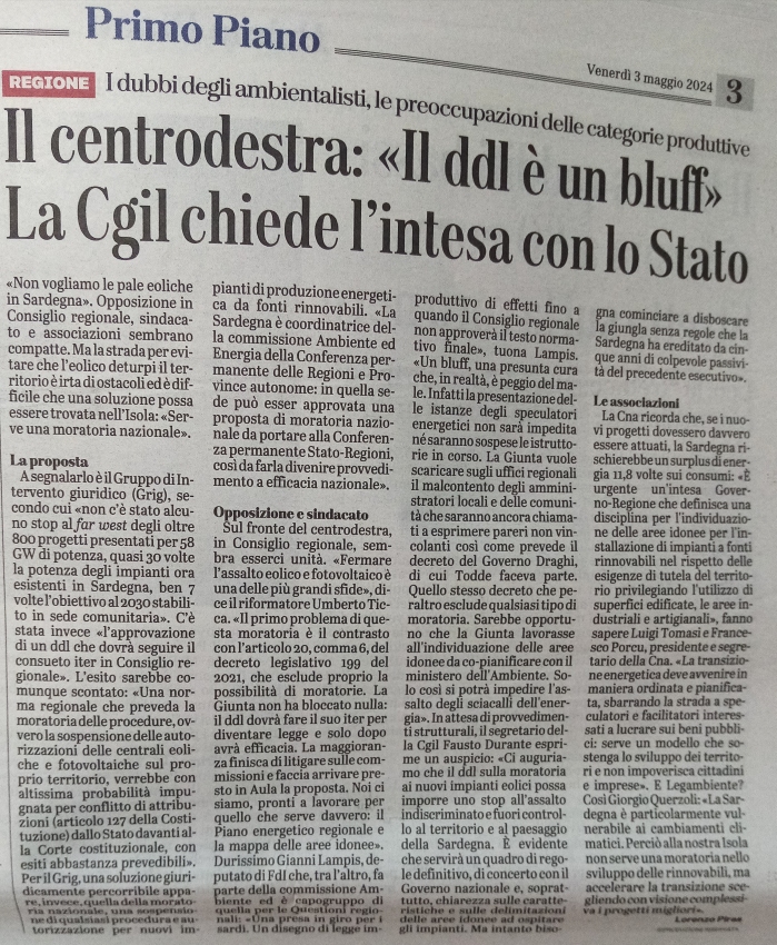 Moratoria fonti rinnovabili della giunta Todde: efficacia dubbia per il GrIG: https://www.sassarinotizie.com/2024/05/02/moratoria-fonti-rinnovabili-della-giunta-todde-efficacia-dubbia-per-il-grig/