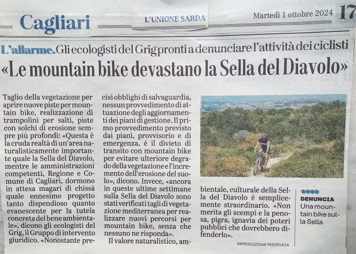 L’allarme degli ecologisti del Grig pronti a denunciare l’attività dei ciclisti della zona che “calpestano la macchia mediterranea con le biciclette senza alcuna considerazione dei danni naturalistici che provocano. Subito il divieto di transito per le mountain bike”: https://www.castedduonline.it/tagli-alla-vegetazione-per-piste-e-trampolini-le-mountain-bike-stanno-devastando-la-vegetazione-della-sella-del-diavolo/