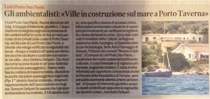 Richiesta di accesso agli atti, ‘cantieri in fascia tutelata’. (https://www.ansa.it/sardegna/notizie/2024/10/15/il-grig-denuncia-ville-in-costruzione-sul-mare-a-porto-taverna_6ba2c332-8b02-4f7d-ac59-01c518485979.html)