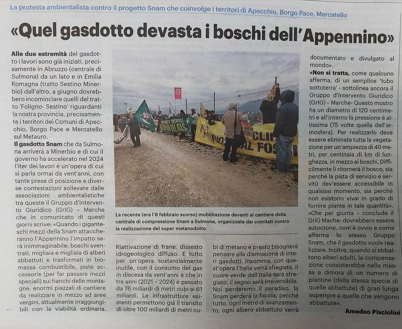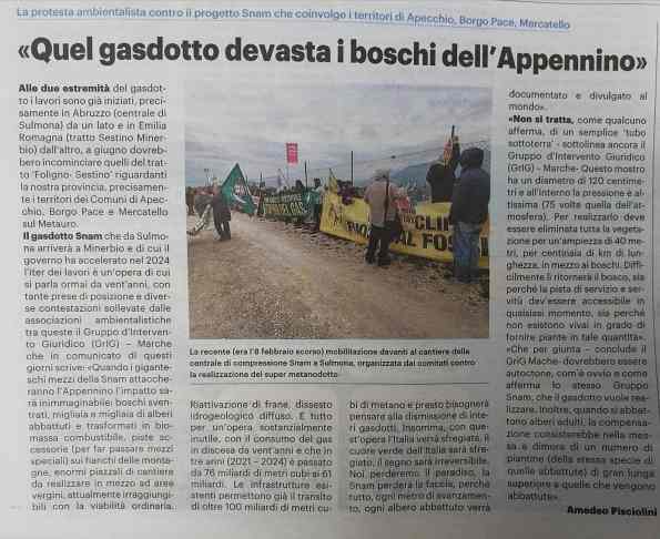 Il gasdotto Snam che da Sulmona arriverà a Minerbio e di cui il governo ha accelerato nel 2024 l’iter dei lavori è un’opera di cui si parla ormai da vent’anni, con tante prese di posizione e diverse contestazioni sollevate dalle associazioni ambientalistiche tra queste il Gruppo d’Intervento Giuridico (GrIG) – Marche che in comunicato di questi giorni scrive: “Quando i giganteschi mezzi della Snam attaccheranno l’Appennino l’impatto sarà inimmaginabile: boschi sventrati, migliaia e migliaia di alberi abbattuti e trasformati in biomassa combustibile, piste accessorie (per far passare mezzi speciali) sui fianchi delle montagne, enormi piazzali di cantiere da realizzare in mezzo ad aree vergini, attualmente irraggiungibili con la viabilità ordinaria. Riattivazione di frane, dissesto idrogeologico diffuso. E tutto per un‘opera sostanzialmente inutile, con il consumo del gas in discesa da vent’anni e che in tre anni (2021 – 2024) è passato da 76 miliardi di metri cubi ai 61 miliardi. Le infrastrutture esistenti permettono già il transito di oltre 100 miliardi di metri cubi di metano e presto bisognerà pensare alla dismissione di interi gasdotti. Insomma, con quest’opera l’Italia verrà sfregiata, il cuore verde dell’Italia sarà sfregiato, il segno sarà irreversibile. Noi perderemo il paradiso, la Snam perderà la faccia, perché tutto, ogni metro di avanzamento, ogni albero abbattuto verrà documentato e divulgato al mondo”.