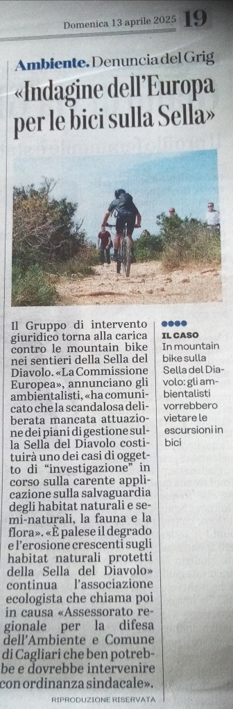 E’ palese il degrado e l’erosione crescenti sugli habitat naturali protetti della Sella del Diavolo determinati dalla perdurante percorrenza con mountain bike e dalla realizzazione di percorsi ciclistici abusivi con danneggiamento della vegetazione e del suolo, denunciati numerose volte dall’associazione ecologista Gruppo d’Intervento Giuridico (GrIG) nella colpevole ignavia delle amministrazioni pubbliche responsabili della gestione delle aree appartenenti alla Rete Natura 2000 composta da 128 fra SIC, ZPS e ZSC, in grande parte gestiti dalla Regione autonoma della Sardegna, come nei casi della Sella del Diavolo.
