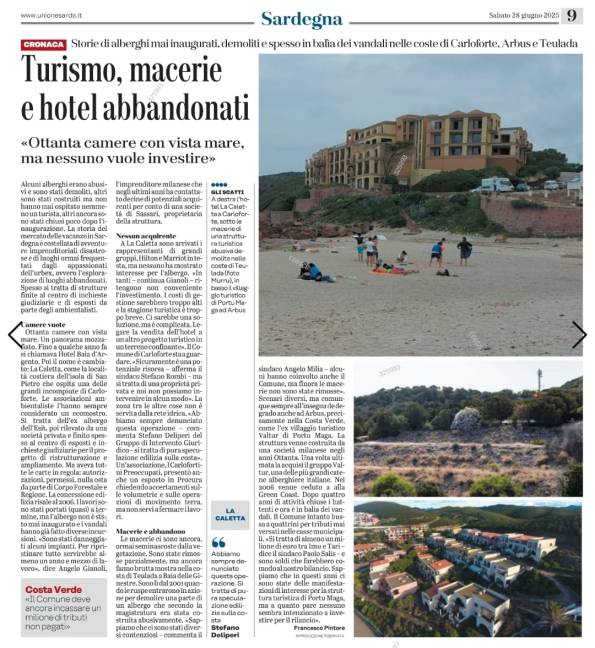 Dott. Deliperi buongiorno. La nota vicenda pare essersi conclusa https://www.galluraoggi.it/olbia/hotel-rio-bados-venduto-asta-svolta-olbia-abbandono-5-luglio-2025/L’amaro in bocca rimane. Speriamo che gli ivestitori/imprenditori altoatesini siano toccati dalla grazia divina e spero che possano superare con il buonsenso e il ripetto delle norme le criticità dell’area e le illegalità ereditate.Grazie per l’attenzione e buona settimana.