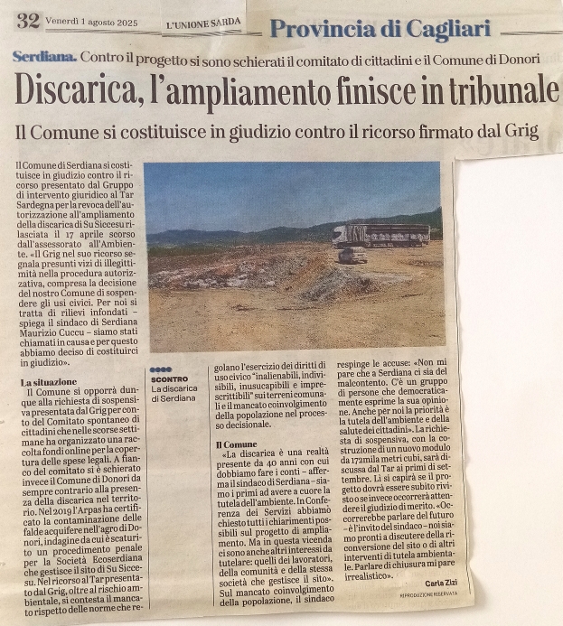 L’associazione ecologista Gruppo d’intervento giuridico (GrIG) ripercorre tutte le tappe della vicenda ed è molto critica nei confronti dell’ultima delibera regionale per un ottavo modulo. Nel corso degli anni sono cresciute le proteste dei Comuni contigui, Donori in particolare, la cui zona artigianale è a 700 metri.