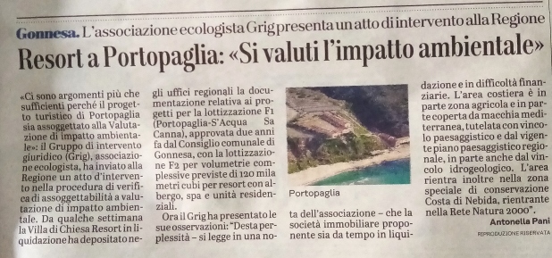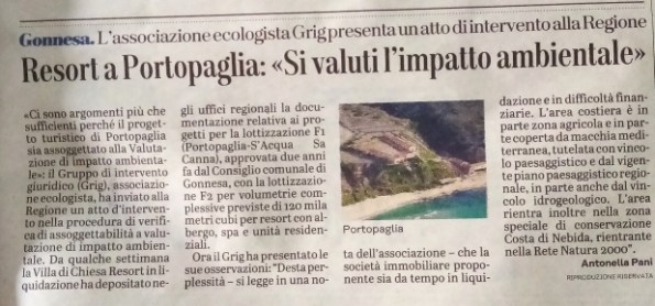 L’associazione ecologista Gruppo d’Intervento Giuridico (GrIG) ha inviato (10 agosto 2025) un atto di intervento nella procedura di verifica di assoggettabilità a valutazione d’impatto ambientale (V.I.A.) relativa al progetto turistico-immobiliare proposto da parte della Villa di Chiesa Resort s.r.l. in località Porto Paglia e Acqua sa Canna in Comune di Gonnesa (SU).