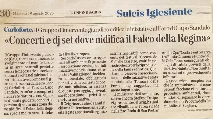 E’ pervenuta la risposta (nota prot. n. 58685 del 15 agosto 2025) da parte del Corpo Forestale e di Vigilanza Ambientale – STIR di Iglesias riguardo l’istanza effettuata (5 agosto 2025) del Gruppo d’Intervento Giuridico (GrIG) di accesso civico, informazioni ambientali e adozione degli opportuni provvedimenti riguardo una manifestazione promossa dalla Pro Loco di Carloforte nei giorni 9 e 10 agosto al Faro di Capo Sandalo con una visita guidata e un concerto sul posto (150 partecipanti) e riguardo la predisposizione addirittura di dj set o musica dal vivo presso un chiosco-bar mobile in orario serale sempre a Capo Sandalo.