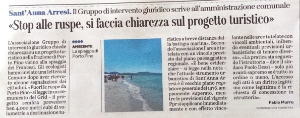 L’associazione ecologista Gruppo d’Intervento Giuridico (GrIG) ha inoltrato una specifica istanza di accesso civico, informazioni ambientali e adozione degli opportuni provvedimenti inibitori relativamente a un progetto turistico-edilizio in località Porto Pino – Spiaggia dei Francesi, in Comune di S. Anna Arresi (CI).