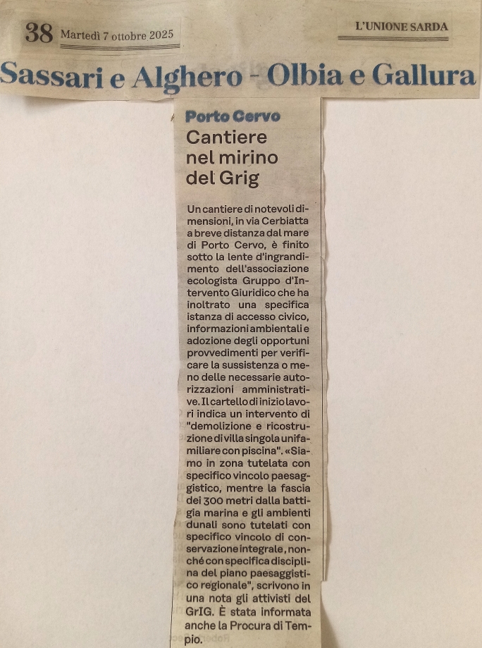 L’associazione ecologista Gruppo d’Intervento Giuridico (GrIG) ha inoltrato (6 ottobre 2025) una specifica istanza di accesso civico, informazioni ambientali e adozione degli opportuni provvedimenti per verificare la sussistenza o meno delle necessarie autorizzazioni amministrative relativamente a un cantiere di notevoli dimensioni in Via Cerbiatta, a breve distanza dal mare di Porto Cervo, sul litorale di Arzachena (SS).