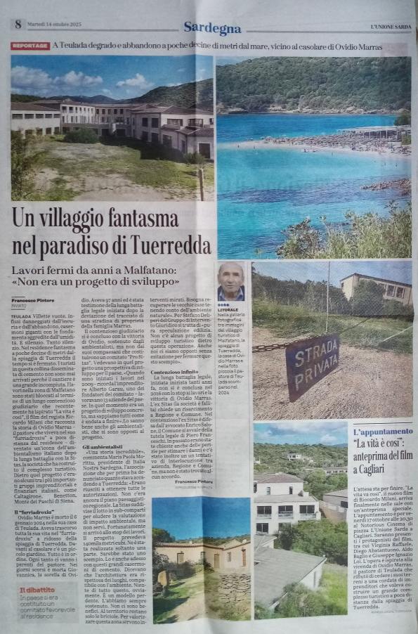 Ovidio Marras è morto l’anno scorso, a 86 anni, nella sua casa sul mare. Poco distante restano le carcasse dei residence mai terminati e finiti all’asta, in attesa di una rinascita che non passi dal cemento, ma dalla memoria, da un turismo più consapevole, che cerca l’altro e riconosce nell’incontro la sua vera ricchezza. Il futuro di Tuerredda ricomincia da qui: dal coraggio di un uomo che amava quel mare “perché è di tutti”. “Aitci anda sa vida”… se ci rassegniamo. Ma non dovrebbe andare così.