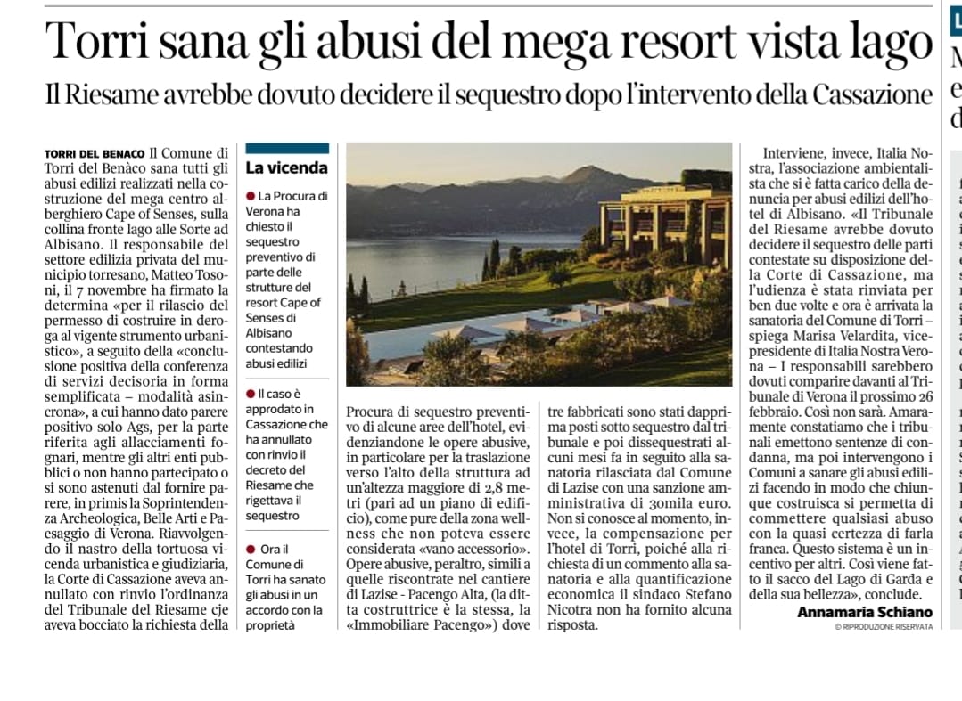E’ il caso, per esempio, del frequentato complesso turistico-edilizio di lusso “Resort Cape of Senses”, realizzato da un gruppo immobiliare altoatesino nella località costiera di Albisano, in Comune di Torri del Benaco (VR).
