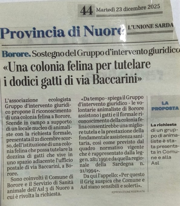 L’associazione ecologista Gruppo d’Intervento Giuridico (GrIG), a supporto di un locale nucleo di animaliste, ha chiesto (21 dicembre 2025) la formale istituzione di una colonia felina che vada a tutelare la dozzina di Gatti (Felis catus) che vive in uno spazio adiacente l’Ufficio postale di Via Baccarini, a Borore (NU).
