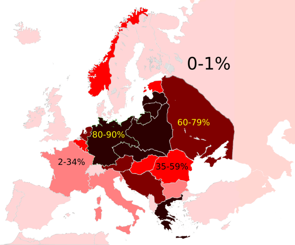 L’Olocausto in Europa. I diversi colori mostrano la percentuale della popolazione ebraica distrutta partendo da quella prebellica esistente (fonte Wikipedia).
