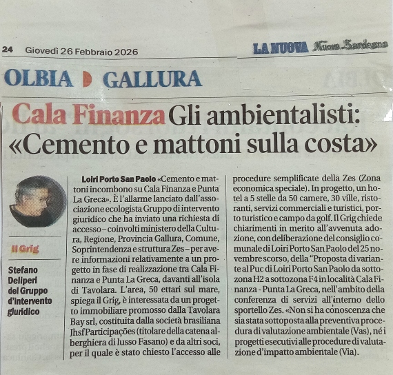 L’associazione ecologista Gruppo d’Intervento Giuridico (GrIG) ha inviato (25 febbraio 2026) una specifica istanza di accesso civico, informazioni ambientali e adozione degli opportuni provvedimenti riguardo l’avvenuta adozione con deliberazione del Consiglio comunale di Loiri Porto S. Paolo n. 50 del 25 novembre 2025 della “Proposta variante al PUC di Loiri Porto San Paolo da sottozona H2 a sottozona F4 in località Cala Finanza. Punta La Greca, nell’ambito della conferenza di servizi ex art.14 bis e seguenti della Legge n.241/1990 all’interno dello sportello ZES Unica del mezzogiorno n.600178. Autorità procedente: struttura di missione ZES, istituita presso la Presidenza del Consiglio dei Ministri dall’art. 10 del D.L. 124/2023 – soggetto proponente: Società Tavolara Bay S.r.l. atto d’indirizzo politico amministrativo”.