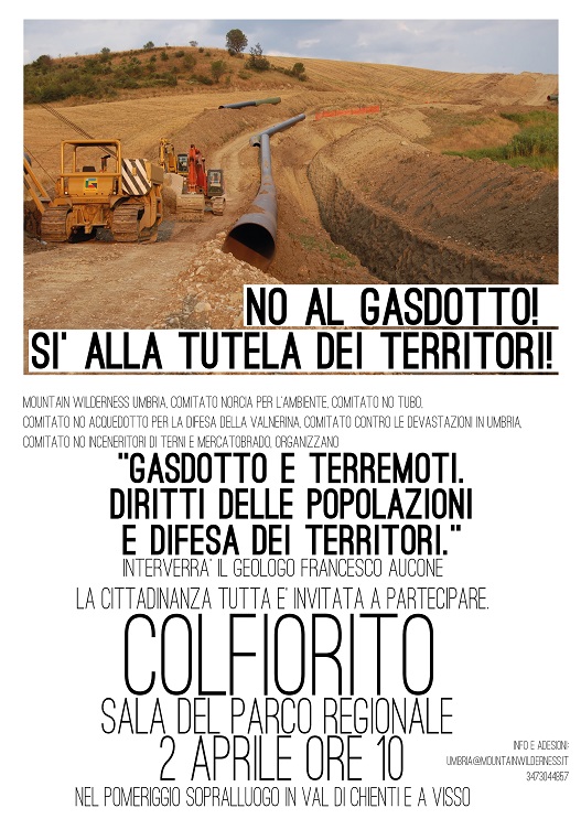 Le associazioni e comitati ecologisti Gruppo d’Intervento Giuridico onlus, Mountain Wilderness – Umbria, Comitato interregionale No Tubo e WWF – Umbria hanno inoltrato (22 ottobre 2017) una specifica istanza accompagnata da perizia tecnica redatta dal dott. geol. Francesco Aucone “Note critiche allo Studio d’Impatto Ambientale redatto da SNAMPROGETTI ed inerente al ‘Metanodotto Foligno-Sestino (SPC. LA-E-83015)’ sezione III – Caratterizzazione della sismicità”. Leggi tutto…