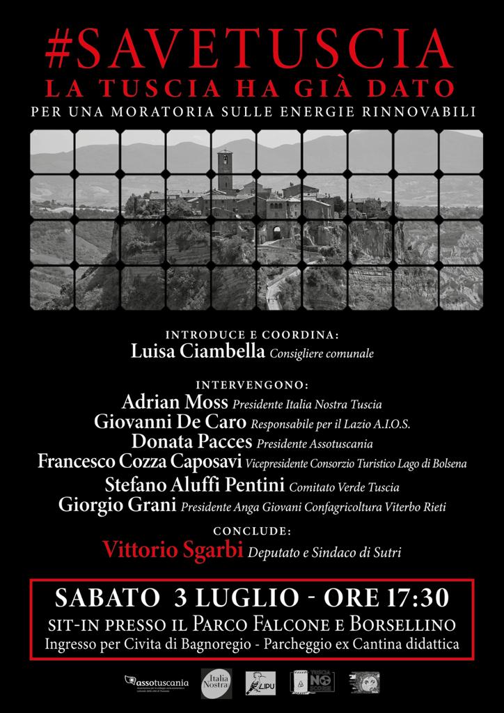 Sabato 3 luglio 2021, alle 17.30, presso il Parco Falcone e Borsellino del Belvedere di Civita di Bagnoregio (VT), si terrà il sit – in popolare #saveTUSCIA, per difendere un paesaggio storico unico e irripetibile aggredito dalla sempre più pressante speculazione energetica.