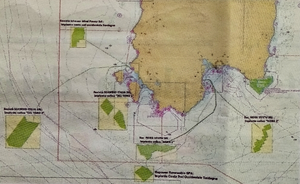Quattordici progetti di centrali eoliche offshore presentati per il mare della Sardegna meridionale, di cui dodici predisposti e depositati presso gli uffici della Capitaneria di Porto di Cagliari per l’ottenimento delle relative concessioni demaniali marittime e due (progetto Sardegna 1 e progetto Sardegna 2) della società abruzzese Renexia s.p.a., del Gruppo Toto Holding, che hanno affrontato direttamente la procedura di scoping per individuare i contenuti dello studio di impatto ambientale necessario per la procedura di valutazione d’impatto ambientale (V.I.A.).