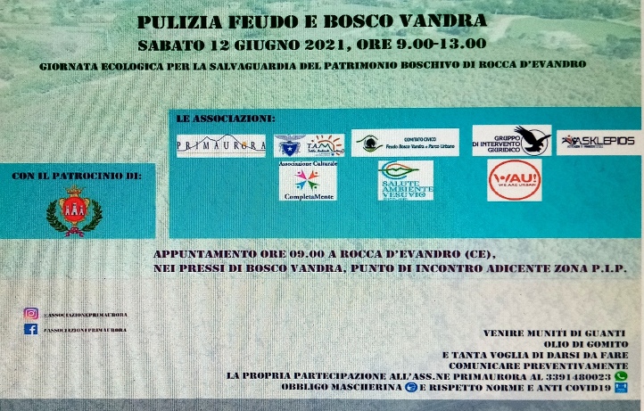 Sabato 12 giugno 2021, alle ore 9.00, appuntamento presso il Feudo Vandra, a Rocca d’Evandro (CE), per la pulizia del bosco dai rifiuti abbandonati.