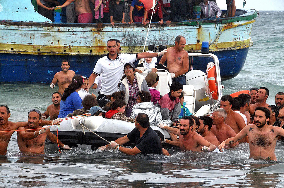 Pachino, la catena umana di bagnanti per aiutare i migranti, 15 agosto 2013 (foto dal Los Angeles Times)