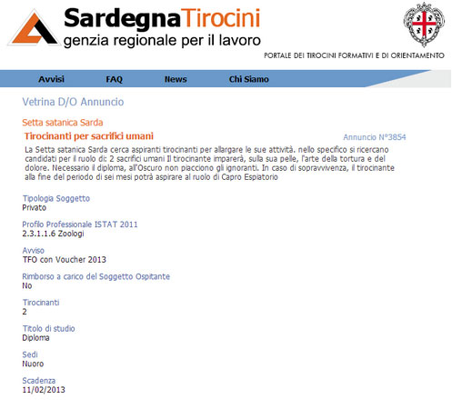Ora è possibile anche candidarsi a due posti di tirocinante per vivere sulla propria pelle l’esaltante esperienza lavorativa del futuro Capro Espiatorio. Leggi tutto…