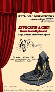 Sabato 31 marzo alle ore 21.00, si terrà a Cagliari, nei locali del Conservatorio Statale G.D. Da Palestrina lo spettacolo di beneficenza a “Avvocato? A chi? Ma mi faccia il piacere!” organizzato dagli studenti della 4° G – IIS Azuni Grafico Cagliari, con gli avvocati del foro di Cagliari.