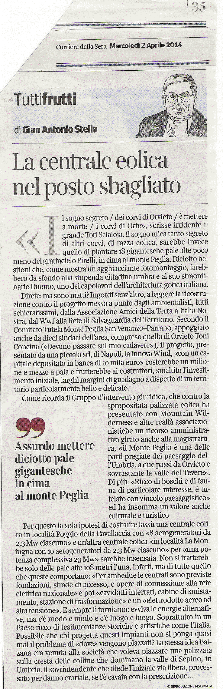 Se la Sardegna è la terra promessa della speculazione eolica, in varie parti d’Italia – soprattutto nel centro-sud – la proliferazione dei progetti di centrali eoliche inutili e dannose per il paesaggio e i contesti economico-sociali è un fatto quotidiano, come quello relativo a due impianti eolici sul Monte Peglia, presso Orvieto (Umbria), avverso i quali anche il Gruppo d’Intervento Giuridico onlus e gli Amici della Terra di Orvieto hanno avviato (22 febbraio 2013) azioni legali.